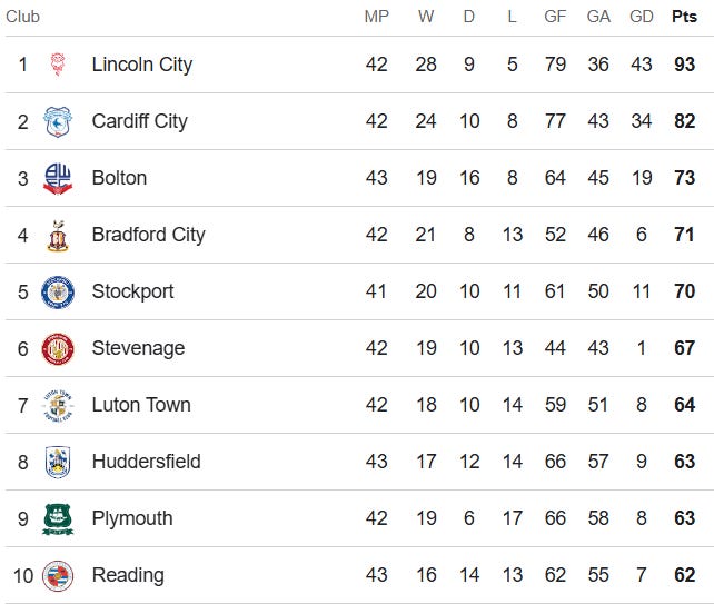 A win for Town on Sunday would leave the Terriers needing just one more win from their remaining two league games to guarantee the title — although just a single point more for Town would probably be sufficient, given their goal difference advantage.
