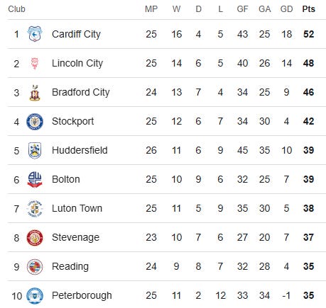 After leapfrogging Town into fourth place last weekend, Stockport are at home to a relegation-threatened Rotherham side in wretched form. Eighth-placed Stevenage will meanwhile go away to in-form Exeter (aside from losing 10-1 to Manchester City — welcome to the club, lads).