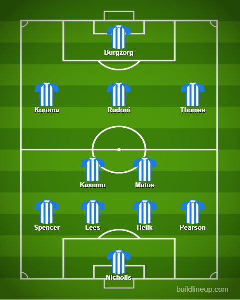 4-2-3-1: Lee Nicholls; Matty Pearson, Michal Helik, Tom Lees, Brodie Spencer; David Kasumu, Alex Matos; Sorba Thomas, Jack Rudoni, Josh Koroma; Delano Burgzorg.