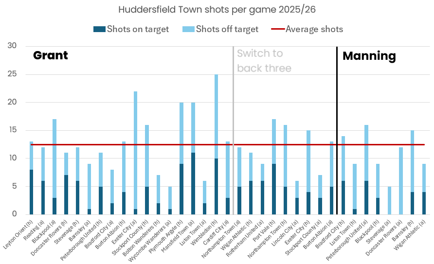 Under Manning, Town struggled to create chances against Luton, Blackpool, Stevenage, Doncaster and Wigan, all of which fell short of the shots per game average for the season.